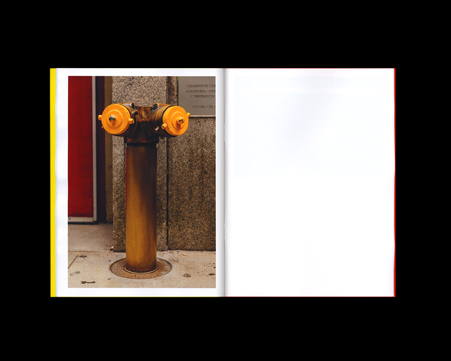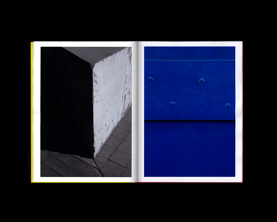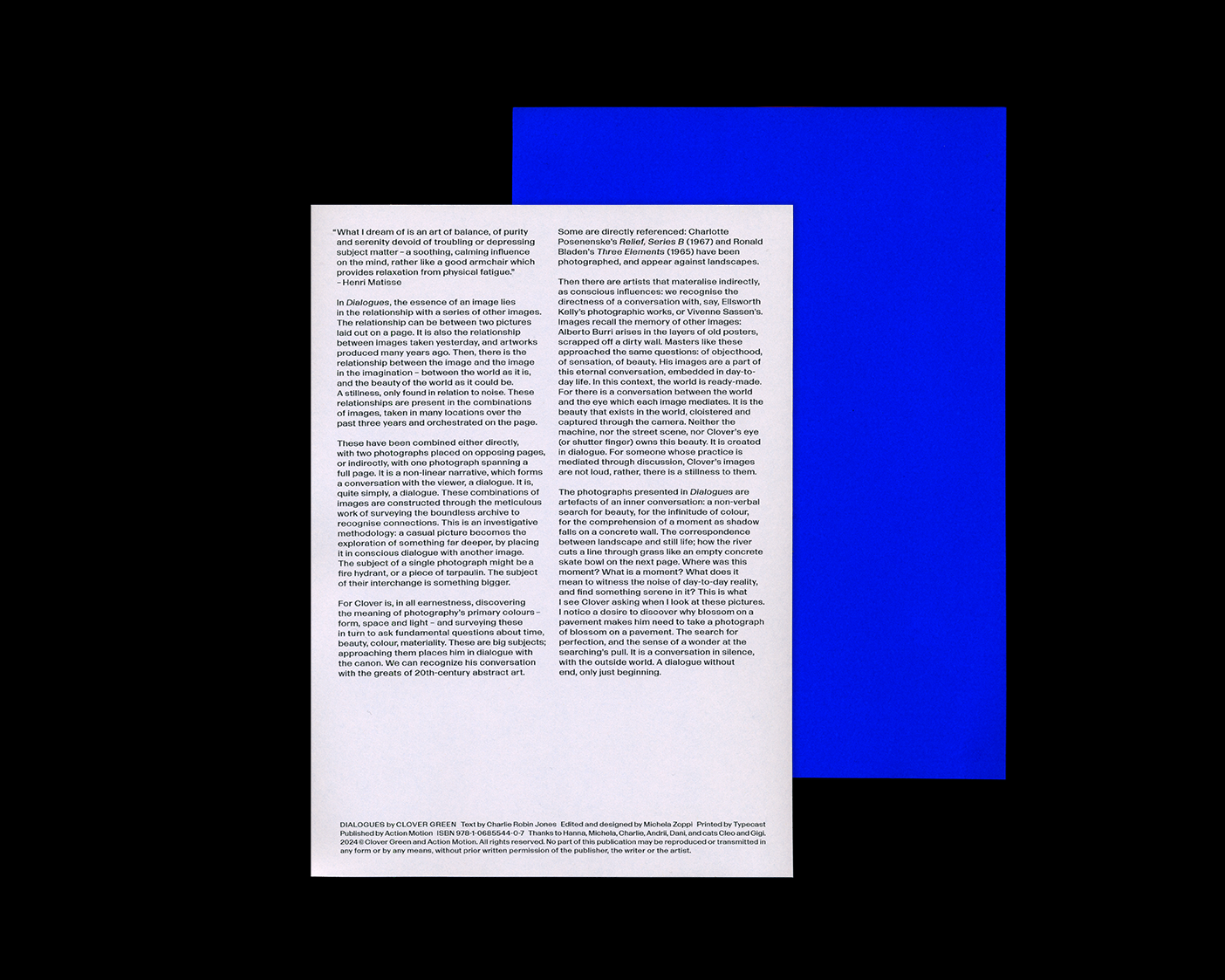 Object, space, and colour form Clover’s painter palette, capturing everyday reality through these fundamental tools. Dialogues explores the interrelation between images, art, and memory. By pairing photographs taken over the last three years, Clover creates an intuitive narrative that reveals relationships between images and objects that would ordinarily exist independently. The book presents a single section mounted into a square-spine cover, with an essay printed on a loose sheet of one-sided blue poster paper, inserted between the pages.