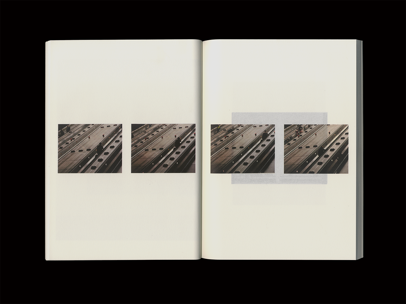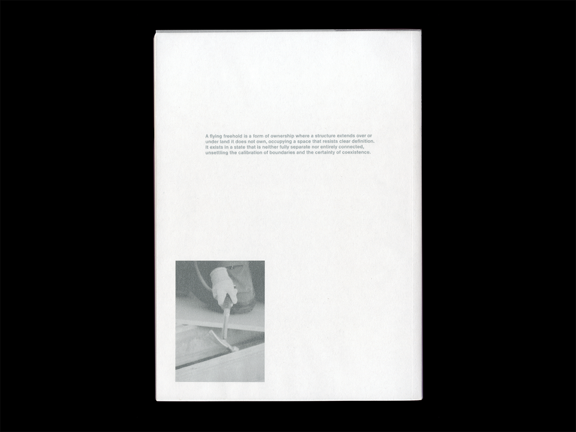Flying Freehold takes its title from the legal term for property extending into spaces it does not own, paralleling the fragmented and impermanent nature of modern life. It reflects on the paradox of claiming intangible spaces like the air or sky and how this mirrors human connection: unseen boundaries, shared but contested spaces, and transient exchanges. The softcover book utilises materials familiar to architecture; the cover image is printed on one-sided white cardboard and wrapped by a translucent jacket featuring silver-printed text. Images flow through the uncoated, warm white pages, incorporating a dynamic combination of full-colour and grayscale images, interspersed with moments of pause.